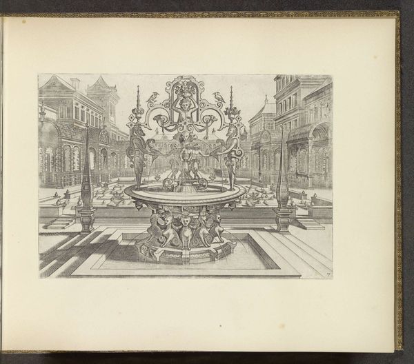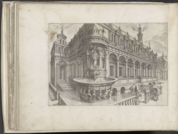 Editor: So, we're looking at "Stadsplein met een ronde fontein" or "City Square with a Round Fountain," created around 1568 by Joannes van Doetechum. It's a pen and engraving drawing. The architecture really strikes me - it's so detailed! What kind of statement do you think a piece like this makes in its time? Curator: Well, think about the role of cities in the 16th century. They were centers of power, commerce, and burgeoning civic identity. This drawing isn't just a neutral depiction; it's participating in the visual construction of what a city *should* be. Note the prominent fountain, a symbol of civic pride, wealth, and technological prowess – the ability to control and display water. How do you think the act of engraving shapes its reception? Editor: That makes sense. Engraving allows for wide distribution, right? So it's almost like propaganda showcasing ideal urban life? But also, the precision gives it an air of authority. Curator: Exactly! These prints were often circulated among elites, architects, and potential investors. They functioned almost like prospectuses. This image would influence ideas of urban design, projecting an image of order and sophistication. Do you notice any social commentary? Editor: Hmmm… Not directly. It's very idealized and feels more focused on the architecture than the people using the space. So, it might reflect the aspirations of the ruling class, rather than the reality of everyday life for most city dwellers? Curator: Precisely. By understanding the socio-political context and the function of visual media like engravings, we see this image less as a simple representation and more as an active participant in shaping societal values and architectural trends. This city square isn't just a place; it's a political statement. Editor: Wow, I'll never look at a cityscape the same way. I guess it's not just about how things *look* but about who is being represented, who it's *for*, and who’s left out.