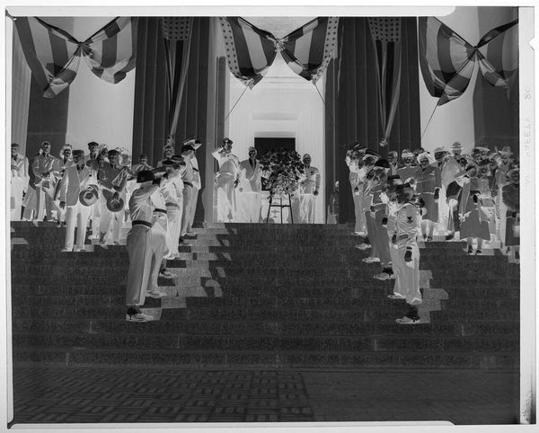 Robert Frank’s photograph ‘Public Ceremony - Casper, Wyoming’ captures a moment, no date given, of civic life. What strikes me first is the flatness, the layering of figures on the steps. The photograph is high contrast; the almost grainy blacks and stark whites create an immediate tension. Look at the way the light falls, it illuminates the edges of the steps while casting deep shadows that obscure the faces. See how this treatment of light creates a sense of anonymity, almost like these figures are stand-ins for larger ideas. The man descending the steps with a rifle slung over his shoulder. This is the heart of the photo. The stark contrast reminds me of some of Walker Evans' earlier work, especially in its unvarnished portrayal of American life. Ultimately, this image gets at the heart of what photography can do: freeze a fleeting moment and invite us to find our own meaning in its ambiguities.