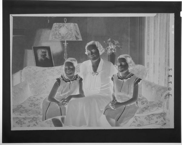 Curator: Here we have an untitled photograph by Martin Schweig, depicting a woman posed with her two daughters, all attired in matching dresses. It is part of the Harvard Art Museums collection. Editor: It has such a ghostly, almost haunting quality, doesn't it? The stark contrast makes it feel distant, like a memory fading at the edges. Curator: Family portraits like this one served a specific function in their time. They projected an image of domestic stability, particularly during periods of social change. Editor: I wonder what their lives were really like behind this carefully constructed image. Were they as perfectly matched as their dresses suggest? Curator: The matching dresses themselves speak to the mother’s role in shaping identity and presenting a united front to the world. Editor: It's funny, how a simple image can evoke so many questions about performance and authenticity, especially in the context of family. Curator: Absolutely. Considering how the image was used and perceived helps us understand its value beyond just its aesthetic qualities. Editor: I'll never look at a family portrait the same way again.