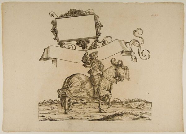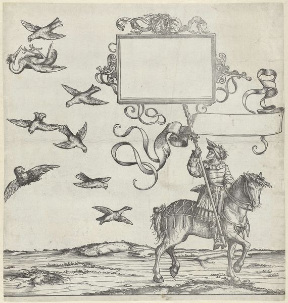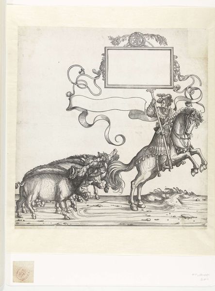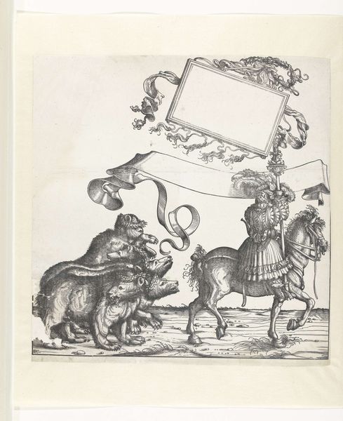 Editor: This engraving, titled "Steenbokken en gemzen en standaarddrager te paard" by Hans Burgkmair, made sometime between 1483 and 1526, is incredibly detailed. I’m immediately drawn to the contrast between the regimented figure on horseback and the herd of animals. What can you tell me about it? Curator: What's striking is Burgkmair’s process itself. Consider the labor: engraving copperplate, multiple impressions allowing for wide dissemination, turning an image into a commodity. The act of making art, transforming raw material, becomes the story. Think of the economics surrounding printmaking at the time. Who had access to these images and what does that tell us about visual culture? Editor: So, you are less focused on the historical narrative, and more on the impact of reproducible media? Curator: Precisely. Consider that this print probably wasn’t just passively looked at. It might have been colored, copied, used as inspiration for other craft objects – textiles, furniture… The relationship between "high art" like engraving and what we might call decorative arts or design gets fascinatingly blurred. Were these prints, then, commodities, prototypes or works of art? What function did the process serve for the artist as labor? Editor: That makes me think about the value assigned to this work versus functional objects. Was Burgkmair consciously challenging established hierarchies with printmaking, or was that an unforeseen result of the method? Curator: It is hard to know Burgkmair’s exact intentions, but looking at the material conditions – the expense of copper, the time investment of engraving, the potential for profit through sales – we gain a clearer understanding of how art functioned within a complex economic system. Perhaps that standard-bearer symbolizes more than just power; he represents a system of production. Editor: So, thinking about Burgkmair less as an individual genius and more as part of a production and dissemination system, reveals a new side to the artwork's historical context. I’ll never look at engravings the same way. Curator: Exactly, focusing on these material processes challenges us to consider the cultural and economic implications surrounding the making of art.