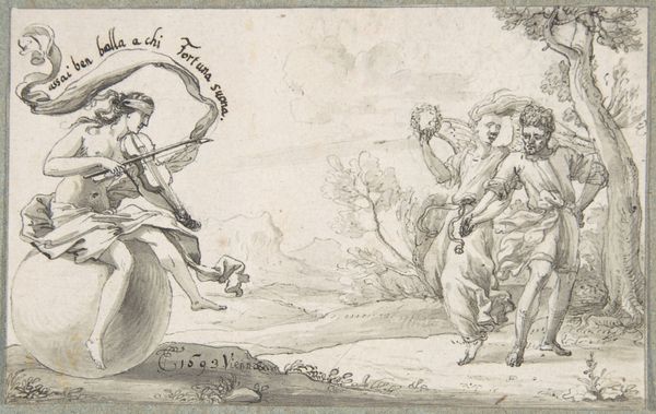 This pen and brown ink drawing by J.F. Clemens presents a preparatory sketch for a title vignette and prospectus of a map of Christiansø. The composition is neatly organized with the title text on either side of a central allegorical scene. The classical figures are rendered with delicate lines and subtle gradations of tone. The symmetrical design of the drawing creates a balanced visual field, which harmoniously blends textual and figurative elements. The allegorical figures, rendered with a neo-classical sensibility, flank the central cartouche. The linear precision and controlled wash suggest Clemens' interest in clarity and order, hallmarks of the Enlightenment. The use of classical figures evokes authority and endows the map with a sense of historical and cultural significance. The drawing may be viewed as an exploration of representation, where cartography meets allegory to communicate not only geographical data, but also ideological values. The work, therefore, serves as more than just a sketch; it’s a structured statement about knowledge, power and visual communication.