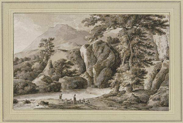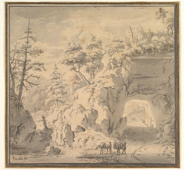 Editor: So, this is Franz Schütz's "Swiss mountain landscape with small bridge spanning a brook," created sometime between 1751 and 1781. It's an etching, engraving, drawing and print. It feels very... staged. Like a theatre backdrop. What do you make of it? Curator: Well, let's consider the historical context. The 18th century saw the rise of the picturesque, where landscapes weren’t just about beauty, but also about conveying particular sentiments and social commentary. Look at how the bridge almost dwarfs the figures, highlighting their smallness against the sublime backdrop of nature. Who has the privilege of accessing this carefully crafted, almost theatrical space? Editor: Ah, so it’s about access and who gets to experience this curated version of nature? I hadn’t thought of it that way. I was mostly focused on the composition. Curator: Exactly. And the ruins—note those broken trees—invite a melancholic reflection on time and human insignificance. How does that feeling intersect with the people on the bridge, who may or may not have social connections? What narrative of class and experience might be implied here? Is the artist simply depicting scenery or making a broader statement about society's relationship to the environment? Editor: I guess the artist is inviting us to think about the narratives behind these scenes, to see beyond the pretty picture. It really reframes how I look at these kinds of landscape images. Curator: It's about deconstructing the layers of meaning embedded within what appears to be a simple, beautiful scene. Romanticism wasn't just about nature; it was often a reflection of the social anxieties and power dynamics of its time. Editor: I’ll definitely look at landscapes differently from now on. Thanks!
