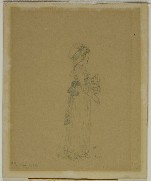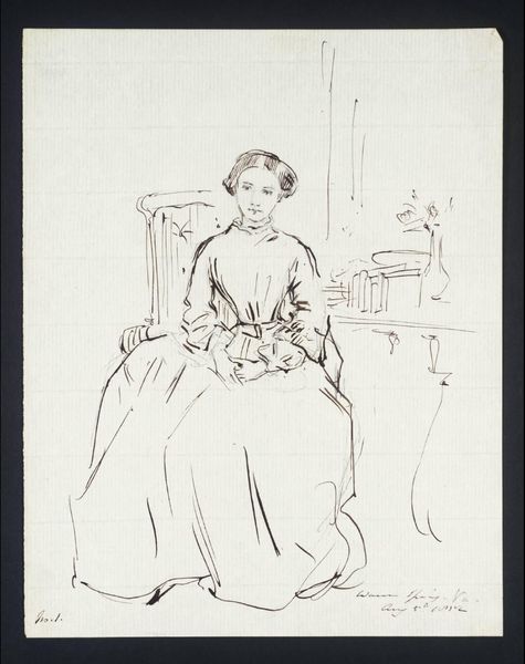 Curator: Looking at this pencil drawing, I’m struck by its quiet melancholy. Editor: Indeed. What we have here is a study titled "The Artist's Sister Sitting at a Table, Seen From Behind," created around 1833 by Christen Købke. This artwork now resides here at the SMK, Statens Museum for Kunst. Curator: There's an intimacy to it despite seeing her from the back, her posture... head resting in her hand... it conveys such a sense of introspection. Do you think it gives us insights into societal roles that his sister might be expected to perform? Editor: Perhaps. Her concealed identity can symbolize the overlooked contributions of women within the domestic sphere. Købke situates her within a very definite composition, one using rather assertive, repetitive verticals for the furniture surrounding her form. She almost vanishes into her own space... Curator: I’m drawn to the economy of the line. With such minimal means, he's captured a wealth of feeling. There are aspects of Romanticism on display, but with such delicate reserve. Editor: I find her dress creates a visual anchor; it’s much more detailed than the suggestion of the figure's face. Købke invites the eye to rest on it... perhaps reflecting bourgeois fashion and feminine identity, subtly asserting its prominence and therefore her agency. It seems significant. Curator: I do also find myself wondering about its contemporary reception... the role such art played for women and their community standing in Købke's social milieu... but beyond the cultural context I’m captivated by that sense of loneliness radiating from the sister as subject, its quiet hum permeating this pencil sketch. Editor: Well, whether as symbol, compositional triumph, or mere expression of transient human mood, it succeeds, I think, in inviting thoughtful contemplation from today's viewer as much as when it was conceived.