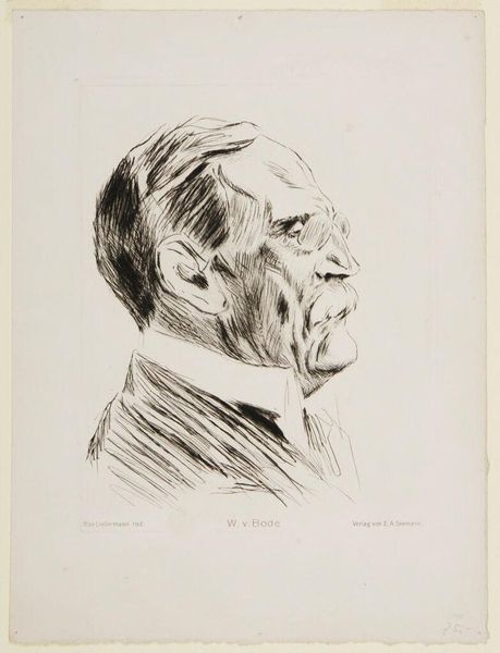 Curator: Gazing at this sketch, "Portrait of Hugo Falander" by Anders Zorn, I'm struck by its immediacy. It feels as though Zorn captured Falander's very essence in just a few fleeting moments. Editor: The etching marks are incredibly deliberate, aren't they? You can see Zorn's hand at work, almost like a dance across the plate. I wonder about the specific tools he used to create those varied lines and textures. Curator: Yes, the materiality speaks volumes. It's more than just ink on paper; it's a conversation between the artist, the sitter, and the very act of creation. I find the image, a bit melancholic. Editor: Perhaps, but I also see strength in the sitter's profile. The way Zorn uses hatching to define the form is remarkable—very economical, yet so effective in conveying volume and depth. It's like a study in the efficient use of line as a tool of social portraiture. Curator: Perhaps it is the economy of the etching, or the sitter's contemplative gaze, but there's a certain intimacy to it, a shared moment frozen in time. It invites reflection, don't you think? Editor: Precisely! The print medium itself allowed for wider distribution, bringing Falander's image—and Zorn's skill—to a broader audience, a fascinating democratizing effect of art production. Curator: Ultimately, it makes you appreciate the beauty in simplicity and how a few carefully chosen lines can reveal so much. Editor: Yes, it prompts reflection on both the tangible process and the wider social impact of even the most seemingly straightforward portrait.