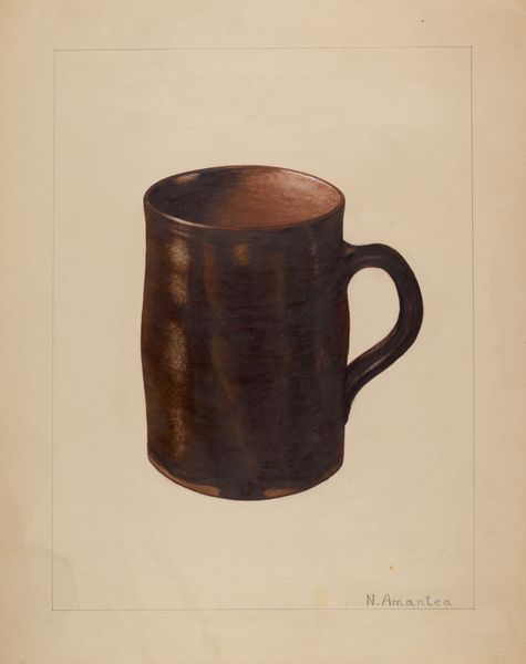 Here we see a mug, by Yolande Delasser. The medium is graphite and watercolor on paper. Notice how Delasser has emphasized the mug's material, capturing its weight and cool color. While it is difficult to determine the original mug's material with certainty, the treatment suggests it's likely pewter, a metal alloy that was popular for dishware because it was relatively inexpensive, and could be easily cast. You can see the attention to detail the artist has brought to the rendering of the mug. It is a reminder of the labor involved in the production of even the most humble, functional objects. The artist's skilled manipulation of graphite and watercolor elevates this simple mug to an object of contemplation, inviting us to consider the intersection of art, craft, and everyday life. In doing so, Delasser challenges traditional distinctions between fine art and craft, reminding us that beauty and meaning can be found in the most unexpected places.