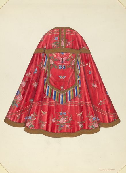 This is Syrena Swanson's rendering of an Ecclesiastical Vestment, made sometime in the 20th Century. The gouache on paper has a delicate, illustrative style, a softer take, maybe, on the original textile’s bold statement. I love how Swanson captured the plushness of the velvet, it’s almost edible, like a red velvet cake, don’t you think? The color palette, dominated by reds and browns, is so warm and inviting. Take a look at how the embroidered floral details are meticulously rendered, each stitch seemingly accounted for. There’s a real sense of care and attention to detail. It reminds me of the work of another chronicler of textile culture, Susan Te Kahurangi King. Both artists invite a kind of intimacy, slowing down our looking, and asking us to consider the stories embedded in each garment. It’s a reminder that art is an ongoing conversation, a dialogue across time and mediums.