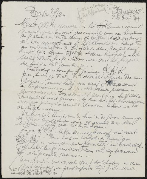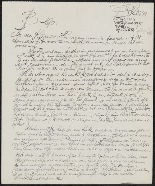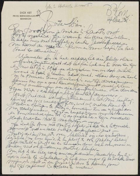 Curator: This piece, "Brief aan Mien Cambier van Nooten," possibly from 1939 by Dick Ket, done with pen and ink, offers such a raw glimpse into the artist’s world. The density of the lettering gives me a very textural feel. What strikes you? Editor: It looks intensely personal and quite claustrophobic, almost frantic. The close, cramped writing seems to trap the words on the page. How do you interpret this work? Curator: For me, understanding Ket's practice means diving into the material conditions of its making. We need to consider what it meant to produce something like this using pen and ink during this period. Was paper readily available? What kind of ink was accessible? The sheer act of transcription – writing, and rewriting, thoughts and images reveals not only an intimacy, but also labor and an embodied connection to the work. Editor: So, you're saying that the materiality—the specific choice of pen and ink, the handwriting itself—is as important as the content of the letter? Curator: Precisely! Think about the artist's hand, the physical act of writing each word. The commitment and the deliberate, time-consuming process it demands. The text is almost woven into the fibers of the paper. Considering Ket's style within the context of broader artistic production highlights a fascinating intersection of "high art" and the traditional domain of craftsmanship. What do you think the repetition in the letter suggests, knowing it's crafted through ink on paper? Editor: It really shifts my perspective to think about it as a physical process. I was so focused on the message, I missed how the very act of creating it might be the point. Curator: Exactly! By recognizing these material and performative aspects, we gain a richer appreciation of Ket's artistic endeavor and it makes the work less alienating. Editor: I will certainly look at artworks differently, considering their material construction more carefully now. Thanks.