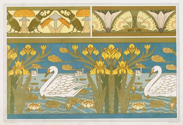 Here we see a print by Maurice Pillard Verneuil featuring two decorative objects and the title suggests these are butterflies, poppies and peacocks. The composition is neatly divided into sections, each showcasing a different pattern or motif, unified by a palette of yellow, green, and mauve. The hanging lantern on the left is adorned with stylized flowers and insects, appearing almost like an illuminated jewel. The vertical vase features peacocks, their forms elongated and elegantly repeated, contrasting with the geometric patterns in the background. Verneuil, associated with the Art Nouveau movement, employs a visual language deeply influenced by Japanese prints. The flat planes and decorative patterns are a key departure from traditional perspective, flattening the picture plane. This challenges traditional notions of depth. The careful arrangement of motifs and colors here creates a harmonious balance that speaks to the decorative arts' broader aesthetic and philosophical concerns. The design invites us to question fixed meanings and to engage with new ways of thinking about space, perception, power and representation in the decorative arts.