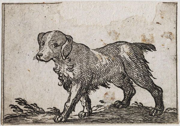Editor: So, this is Antonio Tempesta's "Seated Dog" from around the 16th or 17th century. It's an etching, and it looks so forlorn. What's your take on why dogs were depicted this way? Curator: Consider the historical context. Dogs, like other animals depicted in art, often served as symbols of status or morality. Do you notice anything about this dog's breed or posture that might suggest a particular message aimed at the public? Editor: It's so fluffy and sits so still. It looks like a pampered lapdog, maybe? So, maybe it's about luxury? Curator: Precisely. Its stillness may represent docility or loyalty, traits valued in the upper classes. The artwork could be an assertion of control over the natural world. What do you think that says about power structures at the time? Editor: Wow, I didn’t realize a dog could have so much to say about the times! Thanks. Curator: Indeed. It's amazing how much art can reveal about history.
