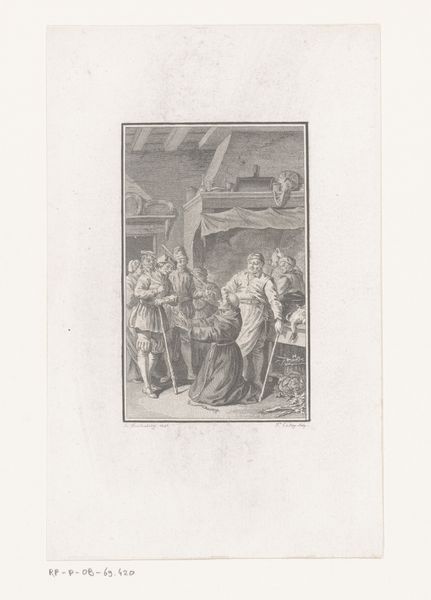 Editor: This is “Man verwelkomt een gezin bij zijn schip,” or "Man Welcoming a Family to his Ship," an engraving by Daniël (I) Veelwaard, created sometime between 1777 and 1818. The scene feels incredibly staged, almost theatrical. What stories do you think are embedded in an image like this? Curator: What I see are the echoes of societal expectations, meticulously etched into the copper. Consider the welcoming figure, poised as a benevolent patriarch. He embodies the ideals of his era – order, civility, and the perceived natural hierarchy. Notice how the family approaches – the young daughter at the forefront, a symbol of innocence and future promise. It speaks volumes about the roles ascribed to women and children in 18th-century Dutch society. What feelings does the family evoke in you? Editor: There's something performative about it. The father looks dignified, the mother composed. Almost too perfect. Like they’re acting out a scene. Does that hint at some specific social commentary? Curator: It might. Ask yourself what it meant to present such a tableau. Perhaps Veelwaard is playing with notions of virtue and prosperity, crafting an aspirational image for the emerging middle class. Consider the ship, not merely a vessel, but a symbol of Dutch power, exploration, and economic prowess. The family's arrival suggests participation in this larger narrative. This all resonates within a shared cultural understanding. Editor: It's like the image is communicating something about national identity too, beyond just a simple greeting. It's powerful how much meaning is packed into what seems like a quiet, domestic scene. Curator: Exactly! Visual language like this actively shapes collective memory. Through his use of symbolism, Veelwaard is not just showing us a scene, but reminding us of who we are, or, more precisely, who we are meant to be. Editor: I never thought about it that way before, that images aren't just passive reflections but active participants in shaping how we see ourselves. Thanks for broadening my understanding!