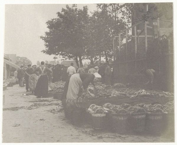 Editor: So, here we have "View of the vegetable auction in Zwijndrecht with the Grote Kerk in Dordrecht in the background", a gelatin-silver print dating from around 1903 to 1910, probably by G. Hidderley. The scene feels bustling, but the monochrome tones give it a stillness, a captured moment in time. What's your take on it? Curator: What strikes me immediately is how this photograph operates as both a record of a specific time and place, and a comment on the social fabric. Look at the composition: the division between the workers in the foreground, seemingly pausing or observing, and the looming presence of the church in the background. Editor: Yes, the church definitely anchors the whole scene. Curator: Exactly. Churches wielded immense power in the lives of everyday people. Juxtapose that with the bustling commerce of the vegetable auction, it really speaks to the duality of life, doesn’t it? The practical, the earthly, set against the spiritual and institutional. Also, note how the market activity dominates the frame – what might that suggest about emerging socio-economic priorities at the turn of the century? Editor: It's interesting that you mention social commentary. I hadn’t initially seen it that way, I was more drawn to the documentarian aspect of it all, but that gives me a new angle to consider! Curator: Consider also who is absent: what socio-economic groups are *not* represented prominently in the hustle and bustle? Understanding such visual absences reveals a lot about societal power structures. Editor: It's so interesting to consider photography not just as capturing reality but also actively shaping how we perceive the past. Curator: Precisely. That tension between photographic objectivity and social agenda is at the very heart of understanding images like this. A useful question: whose version of reality is being presented here? Editor: That's a perspective I'll definitely carry forward. Thanks!