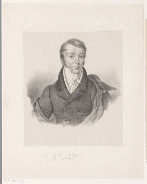 Editor: Here we have Jean Pierre Sudre’s 1818 graphite drawing, "Portret van Jean-Baptiste Collard," at the Rijksmuseum. What I notice first is how… earnest he looks. There's such formality in his expression, in the stark black and white. What stands out to you? Curator: The oval frame and clean lines signal Neoclassicism, calling back to ancient virtues. What meaning was attached to such stylistic restraint, do you think, during the upheavals following the French Revolution? It is fascinating how visual languages are resurrected and given renewed significance. Editor: So the Neoclassical style suggests stability, even aspiration, in a period of big social changes? But the man himself…his expression feels almost…modern in its simplicity. Curator: Precisely. The sharp graphite lines provide a raw honesty, contrasting against the idealized Neoclassical style. How does this contrast impact our perception of Collard? Editor: It makes him more relatable, somehow. Less a symbol, more a person, gazing at you. Curator: And who was he, this Collard? Does the portrait provide clues? Perhaps the clothes? It is intriguing how sitters’ portrayal shapes the audience’s understanding of identity and social roles through a deliberate set of visual codes. Editor: Good question. The buttoned coat implies someone respectable, bourgeois maybe? Curator: Exactly! Notice, too, how the overall composition pulls from Roman portraiture - perhaps he's striving for an elevated status. The choice of visual symbolism constructs powerful cultural associations and meanings around this image. Editor: I see! It’s interesting to think about the language of portraiture – a real blend of individual and type. Thank you for unpacking this portrait. Curator: Indeed, portraits always tell multiple stories.