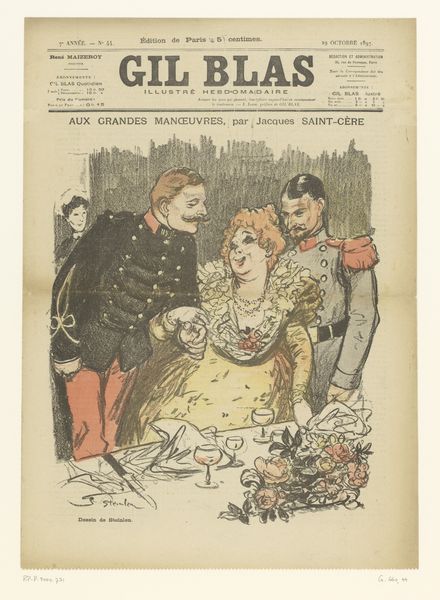 Curator: Here we have a print titled "-Le Rire- magazine" dating from September 29, 1906. The print, likely a colored pencil drawing, is currently in the collection of the Minneapolis Institute of Art. Editor: The composition immediately strikes me—the vignette of domesticity rendered with such chaotic energy! The squiggly lines and off-kilter perspective almost vibrate with a sense of frenetic upper-class life. Curator: "Le Rire," meaning "The Laugh," was a popular French satirical magazine. Its covers often reflected contemporary social and political anxieties, like the fear of societal disruption caused by 'Le Peril Jaune,' or "The Yellow Peril," as noted on the cover. Editor: Notice how the artist uses color to amplify the contrast between the two women. The figure applying makeup, flushed with pinks and yellows, embodies ostentation, while the other, draped in somber browns, projects reserve and pensiveness. Curator: Indeed, this image encapsulates anxieties about shifting gender roles and class tensions at the time. The "syndicat des Jaunes" or "union of the yellow" likely references the social and political turmoil in Europe during this era related to labor movements and their association with foreign entities. This image participates in a complex dialogue surrounding the concept of otherness within French society. Editor: It is a vibrant and disquieting image, achieved through an almost fauvist lens of wild colors and fractured forms, the dynamism practically leaping off the page. You can tell it wants to immediately grab attention and disturb you as you observe more. Curator: Absolutely. It serves as a window into the social attitudes and artistic trends of early 20th-century France. Editor: It's a stark reminder of how visual languages adapt to both celebrate and critique cultural realities. Curator: I'd agree; it's intriguing to consider how our interpretations of the artwork have shifted over time.