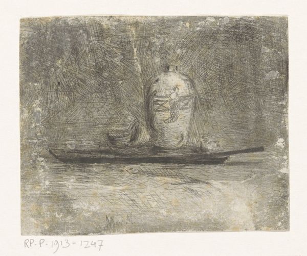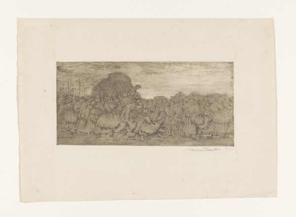 Curator: Theo van Hoytema's "Vijf kuikens," or "Five Chicks," believed to be created sometime between 1878 and 1915. It’s a charming piece rendered with coloured pencils on paper. It is now part of the collection at the Rijksmuseum. Editor: Oh, how sweet! It's a tender, almost naive depiction. The soft colours and sketchy lines give it an immediacy, like a fleeting glimpse into the lives of these tiny creatures. It looks like they're huddling in a nest or foraging. Curator: It’s fascinating to consider this work within the context of genre painting and the rise of impressionism. Van Hoytema, while known for his decorative work and lithography, particularly for posters, captures a specific moment, imbuing it with the sentimentality of the time. Animal depictions were also part of commercial visual culture back then. Editor: Exactly. There's an undercurrent, isn't there? The work sentimentalizes the natural world but perhaps at the expense of really digging into these creatures. Does the painting portray chicks from factory farms? I doubt it. Are we encouraged to consider these little chickens as food or commodity? Probably not, and maybe there’s something revolutionary in that resistance? Curator: Interesting. From a more traditional art historical viewpoint, the emphasis on observation and the rendering of light—despite the subdued palette—aligns the artwork with Impressionistic tenets. Although it also reveals influences of Art Nouveau given the artist's other graphic work. The choice of colored pencils is telling, suggesting accessibility and intimacy. This makes the piece stand apart, compared to other contemporary chick art using paint medium during that time. Editor: Right, but accessibility can also be about accessibility of meaning and ideology, not only availability of media. The composition—the chicks clumped together, yet each with its own personality, all set on some gray, ambiguous ground – prompts a deeper reflection on their individual and collective vulnerability in relation to us, and of our larger ethical commitments, or not. What did people's experiences of industrialisation mean for artists working with rural themes? Curator: Well, these competing notions—nature versus artifice—became defining issues in late 19th century debates on industrialisation. Seen today, the artwork asks viewers to appreciate van Hoytema's attention to nature and light—especially when compared with some modern art that actively challenged academic values, but was equally removed from daily reality. Editor: For me, looking at it now prompts considering how art institutions legitimized genre painting’s moral messages back then, and still do, but also about thinking how images that touch us with such quiet emotion may generate broader compassion today too. Curator: It's been insightful viewing this quietly compelling, deceptively simple artwork together, a drawing that serves as both document of an era and also an enduring mirror. Editor: Yes, a window into then and a mirror for now.