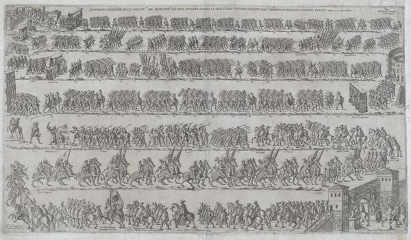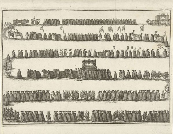 Editor: Here we have Friedrich van Hulsen's "Funeral of King Gustav II Adolf, 1634" rendered with a very detailed pen and ink. The procession format really strikes me; it feels almost diagrammatic. What can you tell me about this work? Curator: It’s a fascinating document of 17th-century statecraft, isn't it? The artist isn’t simply depicting a funeral; he is constructing an image of royal power and social hierarchy. Consider the rows upon rows of figures. Who do you think is represented and what’s their relative place in society? Editor: It seems like each row denotes a different class or rank. There are definitely soldiers and clergy, then nobles. What’s interesting is the deliberate and neat rendering of the procession, I feel that he is interested more in depicting this system, instead of Gustav II. Curator: Exactly! The event becomes a carefully orchestrated performance, reinforcing the existing social order. Think about the context: Sweden was a major power in the 17th century. Images like this, widely circulated through engravings, became vital tools for projecting royal authority both domestically and abroad. They functioned as visual propaganda, reminding everyone of their place. Is there anything else that draws your eye? Editor: Well, knowing it was used as a political tool really helps frame this work and gives this "diagram" greater cultural impact! Now when looking at it, I wonder, in a period with less mass-communication than now, if viewers truly interpreted it that way. Curator: It's a valid point! The degree to which viewers were swayed is hard to know, but even now we react differently based on awareness of the piece’s political dimensions. Thank you for bringing your interpretation to the table!