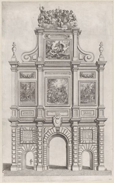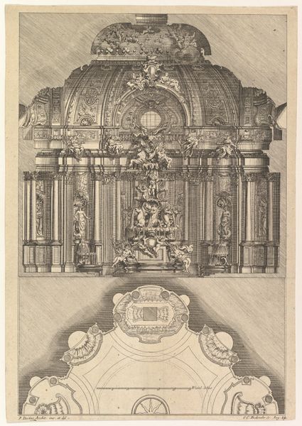 Curator: What an elaborate design! This drawing presents a "Kanselaltaar met IHS in stralenkrans," a pulpit altar with the IHS Christogram within a halo. It's currently held at the Rijksmuseum. Dating from somewhere between 1705 and 1775, this anonymous engraving shows a remarkable Baroque architectural element. Editor: My first impression is… overwhelming! There’s so much intricate detail. The composition seems very vertical and emphasizes this kind of top-heavy grandeur, it would make any preacher feel like an imperial representative of God or some earthly king! It strikes me as rather didactic and severe in its ambition. Curator: Well, consider the period! The Baroque style often utilized these dramatic displays. It speaks to the culture's desire to impress, even overwhelm, the viewer with a show of faith and power, something it would literally enforce when dealing with non-believers. How do you think its function as both a pulpit and an altar affects its symbolism and purpose? Editor: By fusing these two key functions, it suggests an ambition to consolidate religious authority within a single point, one single unified sacred locus, I assume it was aimed at emphasizing top-down, authoritarian religious structures. I am sure these altars served specific, socially manipulative purposes that are easy to overlook. I’d be curious to examine the material costs and craftsmanship. Who made this, what skills did they have and how does this tell a story about artisan work practices? The production tells its own, less overtly glorious, story. Curator: It is easy to overlook that for every flourish here on display, there were hundreds of painstaking hours of unpaid, or poorly paid labour involved in its conception, production, distribution, installation, use, maintenance, policing of access and eventually dismantling! Editor: Precisely. That contrast – the dazzling visual statement versus the hard, material realities of its making – to me that tension is the core of what art like this reveals. It’s a testament to the ability of human beings to produce impressive art under socially damaging conditions, though obviously such conditions also find their way into that art's narrative as well! Curator: Absolutely, a vital historical understanding, offering insights into both cultural ambitions and social structures. Editor: Thanks, so much more to consider about what might otherwise be considered nothing but a beautiful but antiquated piece.