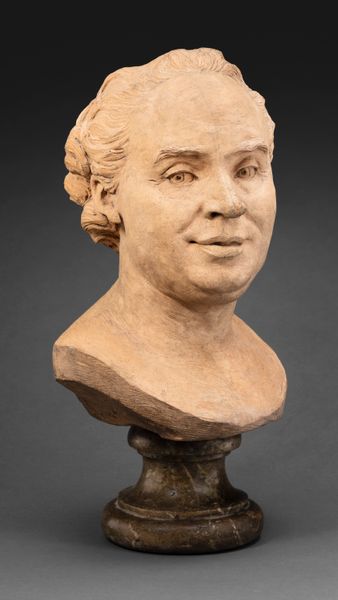 Editor: Here we have Joseph Chinard’s terracotta bust of General Guillaume Brune, dating back to around 1800. I’m struck by the cool, almost detached expression on the General’s face, and the rather formal composition. What stands out to you when you look at this piece? Curator: The emblems of power are certainly prominent: the epaulettes, the sash with its indecipherable symbols... These speak of status, of course. But consider also how Chinard renders Brune's hair – loosely styled, almost unruly. What tensions do you see arising from these contrasting symbols? Editor: I hadn’t considered that contrast. The neat uniform suggests order and discipline, but then you have the more naturalistic hairstyle, which gives him a sort of individualistic quality, in contrast to being a military figure. Curator: Exactly. And that sash? A collection of symbols carefully chosen to convey legitimacy. Consider the language of these emblems: power, honor, perhaps even dynasty are the values being emphasized to the viewer. The artist is presenting not just a likeness but also the *idea* of the General. Does it make you consider any paradoxes or even propaganda embedded within the work? Editor: I think so. I see now that the bust does more than present a man; it's promoting a certain image, building a legacy. Even the material, terracotta, lends a certain warmth and humanity which contrasts the cold, hard marble you often see in Neoclassical sculpture. Curator: Yes, and consider where this would have been displayed. The owner and location could give clues about this man’s role within society, and also the function this work may have served. By using common visual themes from the past the sculpture connects viewers across generations while making him relatable at the same time. Editor: Seeing how the artist used those symbols – the uniform, the hairstyle, even the material – really opens up how we should interpret portraiture as more than just capturing someone's appearance. Thank you! Curator: My pleasure! It's always fascinating to explore how symbols continue to shape our understanding of people and power across time.