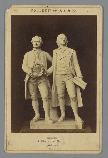 This is a photograph of a plaster cast of the Goethe-Schiller monument in Weimar, held in the Rijksmuseum. The image has a sepia tone, giving it a nostalgic, almost ghostly quality. The stark white figures stand out against the dark background, their forms sharply defined. The composition emphasizes the relationship between the two writers. Their hands are clasped, symbolizing their creative partnership and intellectual camaraderie. Formally, the clasped hands act as a bridge, connecting their individual spaces into a unified field. We can explore the power relations inherent in representation itself. The photograph captures not the men themselves, but a copy of their likeness. Consider how the act of reproduction affects our understanding of originality and authenticity. In doing so, we begin to unpack the layers of meaning embedded within this seemingly straightforward depiction, questioning the very nature of historical representation and artistic creation.