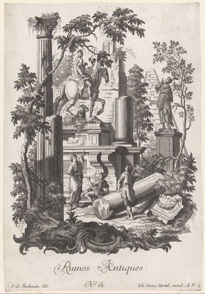 This print of figures with a ladder in a ruined landscape, currently held at the Rijksmuseum, was created by an anonymous artist using etching techniques. Look closely, and you will notice that the linear quality inherent to etching is evident in the fine lines and intricate details throughout the composition. This method involves coating a metal plate with a waxy, acid-resistant substance, drawing into the wax with a sharp needle to expose the metal, and then submerging the plate in acid, which bites into the exposed lines. The depth and darkness of the lines are controlled by the amount of time the plate is exposed to the acid. The skilled labor required for this process points to the commodification of art production, where artisans and workshops produced prints for a growing market, reflecting the increasing accessibility of art to a broader audience. The subject matter itself – laborers amidst the ruins of classical architecture – might even be interpreted as a commentary on the transient nature of human achievement and the inevitable decay of even the grandest structures. Understanding the materiality and historical context of this print enriches our appreciation, challenging traditional distinctions between fine art and craft.