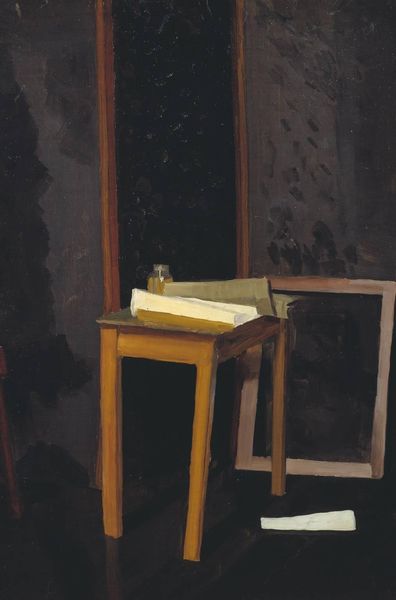 Curator: This is "The Easel of the Artist," painted in 1887 by Franz von Defregger. Editor: There's an undeniable intimacy here, almost a voyeuristic glimpse into a private world. The subdued palette creates a rather pensive mood. Curator: Indeed. Von Defregger gives us a picture within a picture. Observe how the painting on the easel shows a group, possibly a family, seated and engaged, contrasting with the empty studio setting. It’s a juxtaposition between lived experience and artistic creation. Editor: I am drawn to how he manipulates texture with oil paint. There's a beautiful tension between the clearly defined still life and the almost dreamlike figures within the canvas. This duality is highlighted by the rough brushstrokes and the smoothness of the palette. Curator: Note, too, that an easel traditionally symbolizes the creative process itself and can reflect the artist's intentions, inner struggles, or their creative worldviews. Von Defregger appears to be asking questions about representation itself, or at least making the viewer ask themselves. Editor: And he leaves a striking contrast in how each segment interacts with light, pulling us back and forth with its highlights and shadow. The artist masterfully uses this play of light and shadow to give an intimate quality to this genre painting. Curator: Ultimately, von Defregger is portraying the essence of storytelling, both within the artwork depicted on the easel and the story implied by the artist's abandoned tools and surroundings. It's a visual narrative. Editor: A truly evocative image. The use of painterly texture creates an almost melancholic and reflective mood. Curator: Exactly. It provides an avenue to think about how a creator immortalizes their perspective of the world.