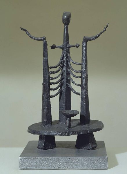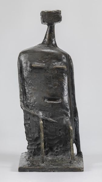 Editor: So, here's Reg Butler's "Circe Head," a bronze sculpture at the Tate. It’s… unsettling. The pins sticking out, the rough texture... It feels both ancient and futuristic. What socio-political commentary might Butler be making here? Curator: Well, Butler was working in a post-war context, deeply affected by the atrocities he witnessed. These spiky protrusions, the fragmented head – could these reflect the psychological fragmentation of individuals in the wake of violence and trauma? Does this sculpture evoke feelings of powerlessness? Editor: It definitely does. It's like a monument to brokenness. I see what you mean about the post-war context influencing this. It makes me think about how art can be a reflection of societal anxieties. Curator: Precisely. And how our understanding of art evolves with our own historical perspective. Editor: That's fascinating; I'll definitely look at Butler's work in a different light now.