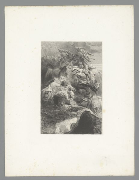Curator: Instantly, a quiet drama unfolds, wouldn't you say? All this tension etched in lines. Editor: Yes, the title is “Huwelijk van een prins,” or “Marriage of a Prince” by Antonio Casanova y Estorach from 1880. It's an etching—rather small in scale but packs a visual punch. I am immediately drawn to that brooding, cloudy background. It really amplifies that drama. Curator: Exactly! It feels more like a clandestine rendezvous than a joyous occasion. The figures almost seem trapped, swallowed up by the darkness closing in behind them. Look how he uses the hatching to evoke weight and atmosphere. I’m just getting a vibe of…foreboding? Like they’re being observed. Editor: Casanova was known for his genre paintings and for situating his figures into period costumes; the social dynamics are what's important. What's going on with them. How public imagery and social customs interplay to communicate certain socio-political standards. Look closely—notice how the light illuminates some figures, especially the central couple, yet others are obscured? Curator: It does add a sense of hidden hierarchy, and perhaps the emotional weight they’re experiencing as a result. There's that almost oppressive quality in the mark-making and shading, creating an almost claustrophobic scene. A feeling, or perhaps anticipation of a profound burden in this arrangement. Editor: Maybe it’s that the medium and the visual culture in the 19th century could disseminate an idea to broader populations in ways that, previously, it couldn't. It really played into that social tension, a premonition you've perceived that is coming to surface here. This feels almost performative; what does it actually feel like to be in that place with them. Curator: I agree. It's fascinating how a seemingly simple etching can evoke such layered, almost gothic undertones. It seems to point to something about the political environment, like we’ve captured a glimpse of the darker side of royalty, beneath all that public staging. Editor: Well, this was a productive look beneath the surface, indeed. Perhaps a longer look here could turn us both into brooding romantics after all.