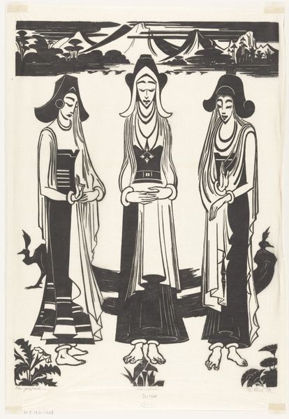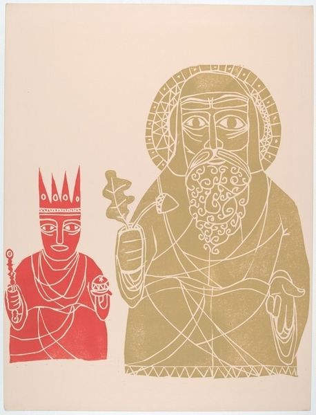 Editor: This is "Four Figures Playing Musical Instruments," a 1957 print by Charles Knowles. It reminds me of medieval art with its flattened figures and simple shapes. How would you interpret this work? Curator: Considering Knowles's print in its socio-historical context, we can observe an intersection of art historical revivalism and post-war artistic sensibilities. The stylized figuration draws heavily from medieval woodcuts, echoing the social function of art during the Medieval period – often tied to religious instruction and community engagement. Editor: So you're saying it’s a deliberate callback? Curator: Yes, but the interesting point is to ask why. Perhaps Knowles was commenting on the role of art in fostering communal identity in an era marked by post-war reconstruction and anxieties. It is also important to remember that the work was made in 1957: The Civil Rights movement, decolonisation, and Cold War paranoia would influence artistic production during that era. Considering the gender of the four figures can offer another layer to the interpretation. Are these female musicians, and does that potentially speak to roles for women during post-war Britain? Editor: That's an angle I hadn't considered! So it's less about nostalgia and more about engaging with contemporary issues through a historical lens? Curator: Precisely. By using this distinctive medieval style, Knowles can encourage viewers to reconsider the social and political functions that art and music may occupy, whilst making statements about gender in his own period. Editor: That makes so much sense. Thank you, this conversation has changed the way I see the print and how it interacts with the wider context! Curator: The pleasure is all mine, let us both look closely at artworks such as this and find their relevance today!