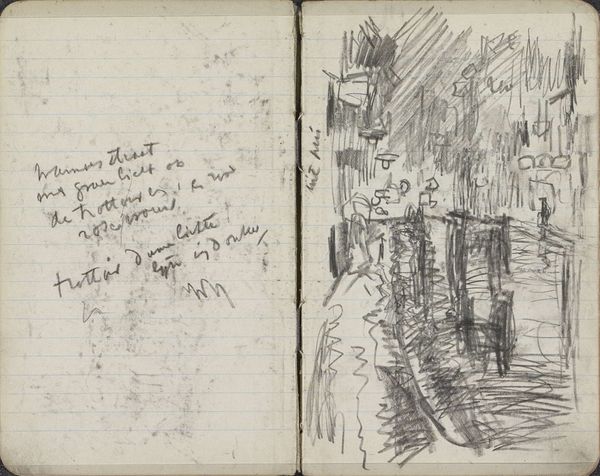 Editor: Here we have George Hendrik Breitner’s “Waspit, possibly on the Lauriergracht in Amsterdam,” made sometime between 1893 and 1898. It's an ink drawing in a sketchbook, and the whole composition feels incredibly intimate, like a fleeting thought captured on paper. What stands out to you? Curator: What immediately grabs my attention is the depiction of everyday life. Breitner, active in a time of significant social change, wasn't drawn to grand historical narratives but focused instead on the experiences of ordinary people in Amsterdam. Look at how the child in the foreground and the background buildings are given equal importance, thus questioning what art considers worth depicting. Editor: So, you see the sketch as a democratizing force in art? Curator: Precisely! And the use of a sketchbook emphasizes this. Sketchbooks are traditionally private spaces for artists, thus blurring the line between the personal and the public. The work becomes about accessibility and challenges the elitism of the art world. I'd be interested to research how class and gender impacted art education, in Breitner's milieu. What about you, what else jumps out? Editor: It feels very modern, doesn’t it? The quick strokes, the focus on a contemporary figure… It seems like it anticipates later movements. Curator: Absolutely. And considering Amsterdam's role as a global port city during this period, how does that intersection of local experience and international influence impact your interpretation? Editor: That international aspect enriches it. Thinking about it now, there’s a quiet dignity in its everyday-ness. Curator: Precisely! It speaks to a radical, almost defiant, act of seeing the value in what others overlooked, even in a sketch. Thanks for lending me your eyes.