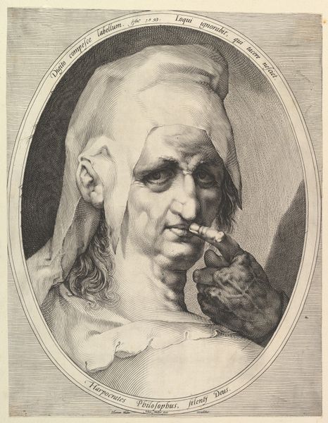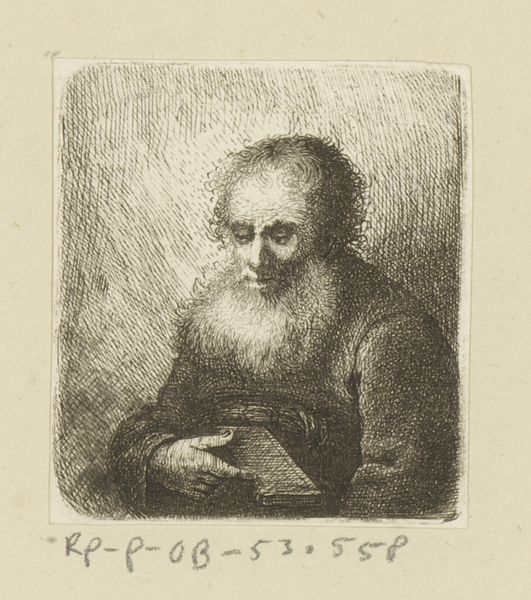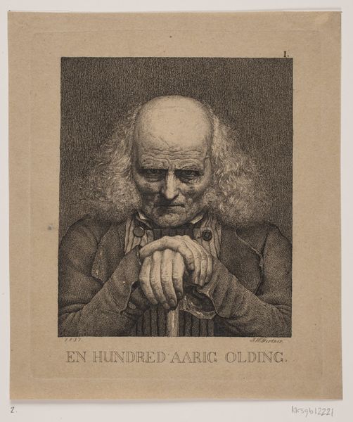 Curator: Looking at this print, "En hundredaarig olding," or "A Hundred-Year-Old Man," by J.V. Gertner, from 1837, I immediately sense a poignant stillness. The use of etching is quite striking, isn't it? Editor: Absolutely. I feel as though the weight of time is etched right onto his face, almost like the lines are geological strata documenting each year. But the pose! The folded hands on that cane—does it strike you as slightly theatrical, despite the realism? Curator: That tension between realism and something…more…is fascinating. For me, the print is really compelling as a work about mortality. Gertner uses these intense, almost frantic lines to map out the face, giving us not just a portrait but a kind of ageographical study. The face becomes this landscape of wrinkles, each shadow hinting at memories, battles, perhaps regrets. It is worth remembering the social contexts around portraiture during this period in Denmark and the value judgments often embedded in such likenesses. Editor: Indeed. The etching itself, with its contrasting areas of deep shadow and sparse light, guides the eye. There’s a semiotic density here. I'm intrigued by how the light catches only parts of his hair, yet illuminates his bare head. That compositional choice pulls you to the most vulnerable point. Notice the contrast between the densely worked background and his head? It pushes him forward and emphasizes his presence despite his obvious physical frailty. Curator: Frailty and resilience all at once. There's a real push and pull going on! And don't you feel that this isn't just *any* hundred-year-old man? There's a certain…gravity…to his gaze that transcends mere age. Like he’s carrying something profound. That something keeps pulling me into his space, it keeps evoking in me a certain mood, maybe I could call it, thoughtful reverence! Editor: A perfectly apt way of describing the aesthetic feat achieved here. The artwork is so powerful and evokes just such reflections in its viewers. Well, I must say, looking at this makes me want to reflect on the passing of time.