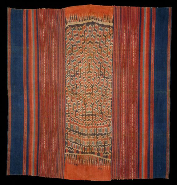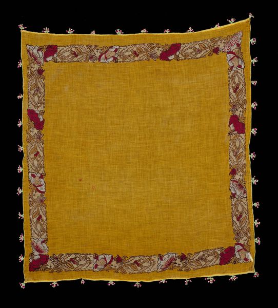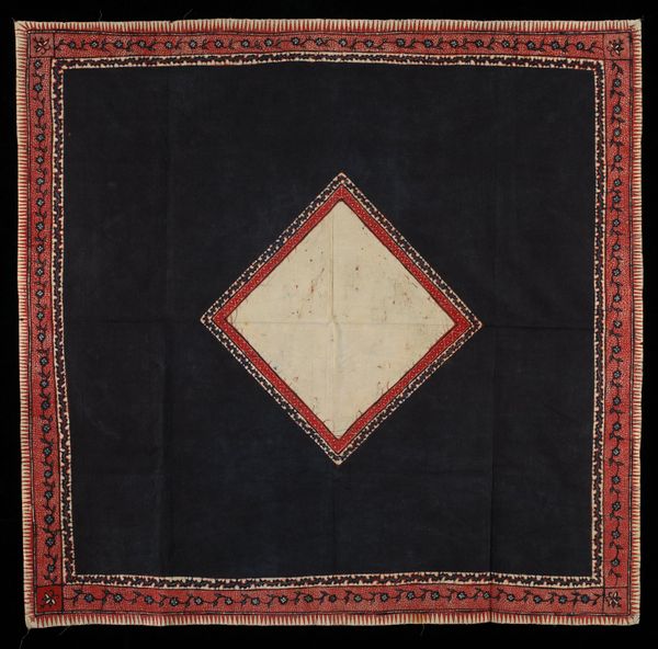 This is a shawl, crafted by an anonymous artist, and currently held at the Minneapolis Institute of Art. The dominant visual experience is of a vibrant red square, bordered by intricate, decorative patterns. Notice the interplay of solid color and detailed ornamentation, which evokes a sense of both boldness and refinement. The structure of the shawl reveals a fascinating interplay between simplicity and complexity. The central field of solid red serves as a grounding element, while the ornate border introduces a layer of visual complexity. These borders are densely populated with paisley motifs and geometric shapes that create a rich tapestry of forms. These detailed patterns function as signs within a larger cultural code, reflecting the artisan's skill and perhaps the shawl's intended function as a status symbol. The shawl’s form challenges fixed ideas about textiles, blending art and function. This interplay invites ongoing interpretations, as the shawl exists as both a practical item and a visual statement.