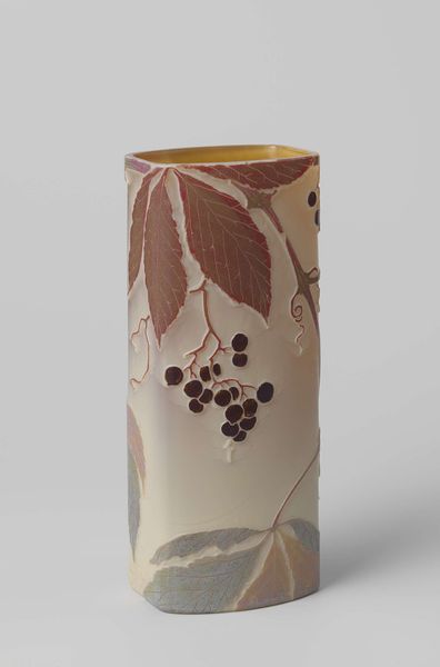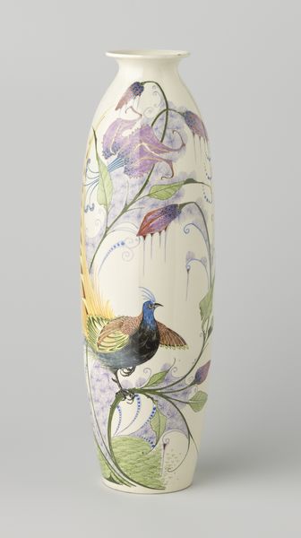 Editor: So, this is an untitled ceramic vase by Takegoshi Jun, created in 2005. What immediately struck me were the kingfishers. They almost seem superimposed onto the delicate bamboo stalks. What’s your interpretation of this piece? Curator: This vase, with its kingfishers, evokes the complex relationship between tradition and modernity in Japanese art. I see in the vase an engagement with 'Orientalism' – how the West has perceived and exoticized the East. How does the vase affirm, challenge, or perhaps play with our ideas of cultural exchange and artistic identity? Editor: I hadn’t considered that. The kingfishers are quite vibrant and pop against the neutral background, but I’m not sure how that ties into those larger cultural narratives. Curator: Think about the symbolism embedded in these choices. Kingfishers themselves carry symbolic weight in many cultures – often linked to prosperity and good fortune. Consider also, the flattened perspective which also might reference earlier traditions. But it’s been filtered through a contemporary lens, almost like a Pop Art reimagining of a classic motif. Editor: So, it's not simply a beautiful vase, but also a commentary on how cultural symbols are reinterpreted and perhaps commodified in art? Curator: Precisely! Takegoshi invites us to question the role of the artist as a cultural interpreter and how these interpretations can reinforce or subvert existing power structures. What does it mean for an artist in the 21st century to revisit these traditional motifs? Editor: I see the kingfishers differently now, understanding the deeper implications of their presence. I definitely have to revisit how symbols are being deployed in artwork now! Curator: Agreed! Let us not forget to engage with art from diverse contexts and historical periods. This helps foster more inclusive narratives in art history.