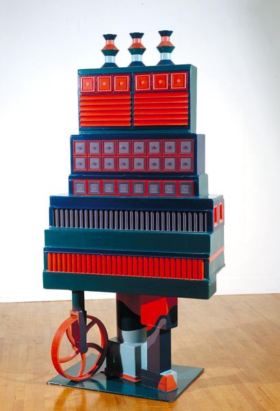 Curator: Bill Woodrow, born in 1948, created this assemblage titled "Car Door, Ironing Board and Twin-Tub with North American Indian Head-Dress." What are your initial thoughts? Editor: Stark. It's a strange coming-together of discarded domesticity and appropriated cultural symbols. The materials look scavenged, almost like remnants of a forgotten age. Curator: Precisely. Woodrow is known for transforming waste materials into potent social commentary. The juxtaposition of household items with the headdress invites us to consider issues of consumerism, cultural appropriation, and identity. Editor: The means of production are integral here, aren't they? The transformation of scrap metal speaks volumes about labor and the cycle of consumption. It challenges the hierarchy between art and craft. Curator: Absolutely, it reframes the narrative. The found objects become imbued with new meanings as they’re situated within a post-colonial discourse. The headdress, once a symbol of power, is reduced to material, a relic alongside the mundane. Editor: It's a powerful statement on the weight of history. Curator: Indeed. Woodrow forces us to confront uncomfortable truths about the legacies we inherit. Editor: A challenging piece that really makes you question what is valued in society. Curator: A vital interrogation of our relationship with objects and the narratives they carry.
