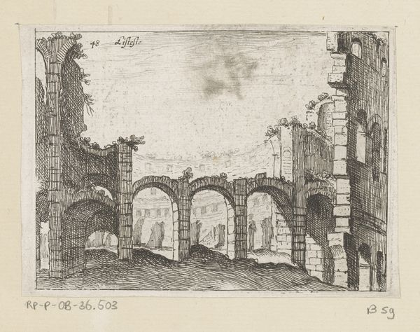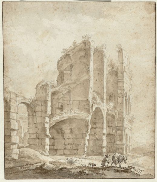 Editor: Here we have Adriaen Honich's "View in the Colosseum, Rome," from around 1667 to 1680. It's an ink drawing, quite striking in its starkness. The ruins are so meticulously rendered. How do you approach a work like this, where the subject is so much about material decay? Curator: I immediately think of the labour involved. Consider the Roman builders, quarrying, transporting, and assembling those colossal blocks. Then fast forward to Honich, the artisan recreating this monumental architecture using relatively inexpensive ink and paper. It's a commentary on the passage of time and how value shifts, isn't it? Editor: That’s a very interesting point, I never considered the comparison of the materiality. Can you expand on the idea of value shifting? Curator: The Colosseum, originally a site of spectacle and power, is now presented as a ruin, a source of artistic inspiration and tourism. Honich, by choosing drawing—a readily available and portable medium— democratizes this symbol of imperial might. He is saying something about access and ownership through artistic production. Editor: So the choice of ink, a relatively common material, challenges the Colosseum's historical significance? Curator: Precisely! It subtly questions what we deem "high" art and whose stories get told. Look at the detail in the stones – each stroke represents a unit of labor, echoing the original construction but also, significantly, Honich’s own artistic labor and the cultural fascination with ruins as commodities. Editor: So much more than just a pretty picture of an old building! It really highlights how materials shape our understanding of history and power. Curator: Indeed! It prompts us to consider the social context of artmaking, how materials both reflect and challenge existing power structures.