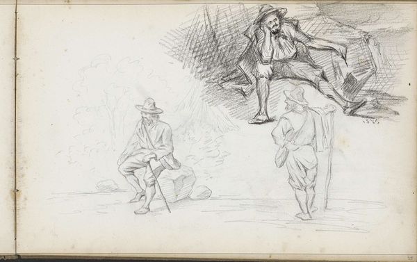Curator: This pencil drawing, currently held in the Rijksmuseum, is titled "An Indigenous American Points Out a Group of Figures to a White Man". George Hendrik Breitner likely created it sometime between 1871 and 1876. Editor: There's a distinct tension conveyed in such a sparse image, isn't there? A power dynamic seems embedded even in the casual, sketched nature. Curator: Absolutely. Consider the landscape tradition within which this piece resides. The positioning of figures within a landscape speaks volumes. Note the gaze, the weaponry, the differing attire... these are loaded signifiers. It prompts the question, "What narrative is Breitner invoking?" Editor: Exactly. Who is telling this story, and from what vantage point? The drawing's realism contrasts sharply with the romanticized narratives of the "noble savage" prevalent during this era, yet it also doesn't shy away from showing indigenous people in relation to colonizers. I read a level of implied complicity here; a discomfort that asks me as the viewer to recognize the dynamics being represented. Curator: The fire and the figures at its periphery carry strong symbolic weight, speaking to the heart of the representation. Fire can symbolize renewal, destruction, purification. In this drawing, perhaps Breitner aimed to encapsulate something of the ambiguous role of transformation – destruction as innovation and tradition being replaced? The white man with his rifle embodies a sense of static authority that will inevitably impose his worldview and his actions on others. Editor: I agree. This piece encourages a reading that incorporates power and historical consequences into art, showing an unequal exchange occurring where neither party appears in control of what happens next. The indigenous person points to their people. Their people are presented as being outside this exchange of power, in the far left distance. Curator: This drawing serves as an invitation to interrogate colonial history and legacies of violence inherent within artistic representation, but simultaneously provides subtle acknowledgement of continuity through shared symbolism across civilizations. It reminds me that cultural memory is always actively reshaped, never a static entity. Editor: Ultimately, looking at a piece such as this forces me to confront the complexities and discomforts inherent within historical narratives that inform our contemporary understanding.