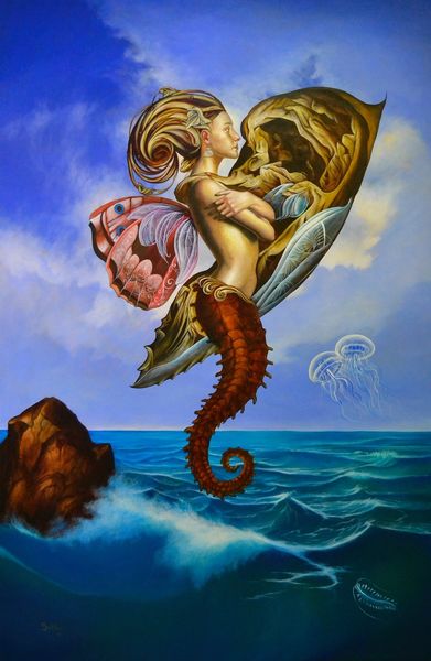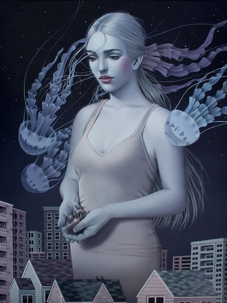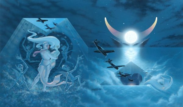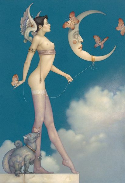 Michael Parkes painted ‘Moonstruck’ using oil paints, a medium that has been a cornerstone of Western art for centuries. The slow drying time of oils allows for meticulous blending, visible here in the ethereal gradations of the moonlit sky. The artist's hand is evident in the smooth, almost porcelain-like finish of the figure, achieved through layers of glazing and careful brushwork. The application of the paint results in a luminous quality that captures the otherworldly atmosphere of the scene. There's also a lot of labor involved in the production of traditional oil paintings, from preparing the canvas to mixing pigments. Parkes' technical skill, combined with the symbolic imagery, transports us to a dreamlike realm where myth and reality intertwine. It's a painting that invites us to contemplate the mysteries of the cosmos and the power of artistic imagination.
