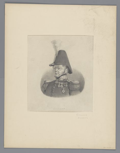 Editor: Here we have "Georg Ludvig von Schulenburg," a 19th-century lithograph portrait. It gives off a serious, almost severe vibe. I'm curious, how do you interpret this work considering the historical context it emerges from? Curator: It’s fascinating how a portrait, seemingly straightforward, can reveal complex societal structures. Consider the subject: a figure of obvious status, his identity asserted through military garb. How might his representation uphold or challenge power dynamics of the time, given the rise of nationalism and evolving class structures in 19th century Europe? Editor: So it’s not just a likeness, but a statement? Curator: Precisely. The artistic choices, like the realism you pointed out, served to reinforce a certain image, but also reflected emerging notions of the individual within larger societal narratives. Does the way he’s presented strike you as an attempt to legitimize his authority, perhaps in response to social unrest or changing political tides? Editor: That's a really insightful point, it makes you wonder if there were specific anxieties around aristocracy at that moment in time that this portrait is responding to. Thanks, that definitely reframes how I see it. Curator: Art offers these reflections. Hopefully this unveils how artworks like these, seemingly of their time, engage in timeless dialogues about power, identity, and the gaze. Editor: It certainly does! I’ll be paying much closer attention to those layers from now on.