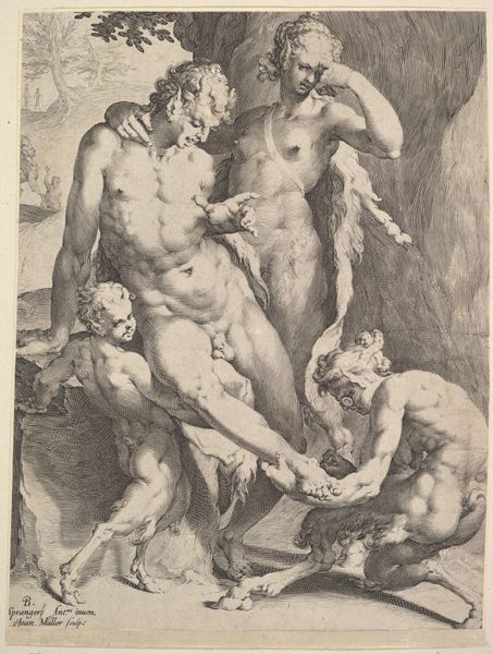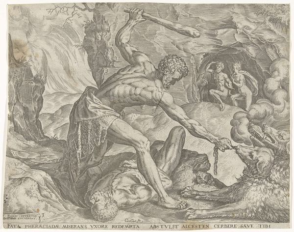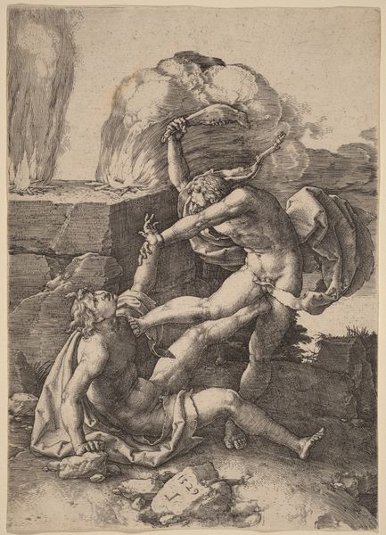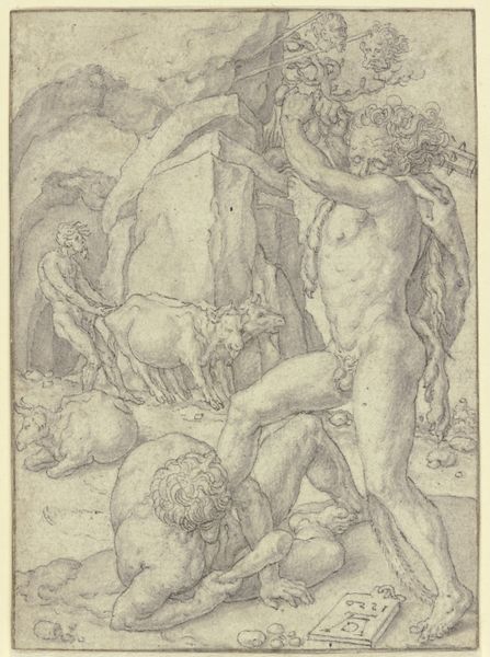 Curator: Look at this intriguing drawing, "Hercules and Cacus," rendered in charcoal by Jan Gossart. The work was produced sometime between 1518 and 1528 and it's now held at the Rijksmuseum. Editor: My initial reaction is one of drama, a raw brutality even in the medium of charcoal. The contrast of light and shadow emphasizes the tension, the looming figure above about to strike, a foot planted firmly on the victim below. Curator: Indeed, Gossart really harnesses the capacity of charcoal here, particularly focusing on the textures and layering which evoke not just a visual narrative, but also hints at the social forces at play. Note how the composition subtly positions Hercules in a more privileged location to perform a public act. Editor: Speaking of that contrast again, it is used to monumental effect! The interplay between the smooth musculature of the figures and the jagged, almost violently rendered rocks is fantastic. The use of cross-hatching also makes the whole piece appear more dynamic. Curator: Considering the history, Cacus was a monstrous fire-breathing giant and the son of Vulcan. This piece could represent an exploration of social anxieties and how societal order should prevail by brute strength if required. Editor: And even considering all of that historical narrative, I keep coming back to its formal achievements: the bold lines and chiaroscuro effects that elevate the composition beyond simple illustration, or merely documenting of historic class wars, as it almost leaps off the page. Curator: True. The application of the Northern Renaissance style with its commitment to representing classical subjects would appeal to aristocratic collectors wanting validation, of possessing classical learning through artworks in their household. Editor: I think you've made me see the charcoal as more than just the medium to display the struggle of these protagonists but as an expression of the human drive itself to achieve greatness or meet their brutal end! Curator: Perhaps we can also admire Gossart’s subtle way of blending human figures into a grand socio-political debate— it’s a perfect illustration of culture and its context.