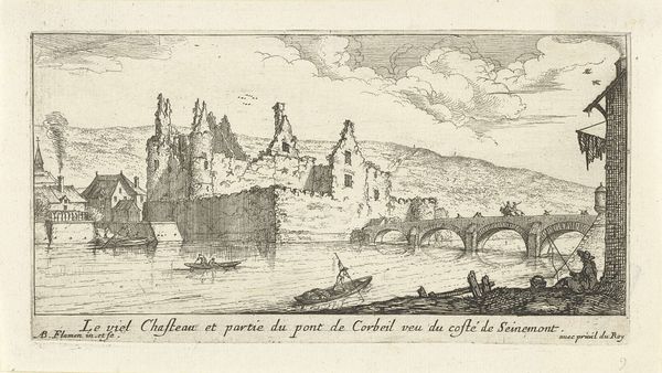 Editor: Here we have Israel Silvestre's "View of the Bastion of Saint John in Pierre Scize", a baroque engraving, likely from sometime between 1631 and 1691. There's something about this old engraving style that feels so removed from modern life, almost dreamlike. What's your read on it? Curator: Dreamlike indeed! For me, it whispers tales of a world observed with a cartographer's precision and a poet's heart. It’s more than just a landscape; it's a stage, isn't it? Look at how the light plays on the water, almost like a spotlight. It draws you in to this imagined space. And the boats – like tiny thoughts floating across the surface of the mind. Don't you feel a gentle melancholy, a sense of time slipping by? Editor: Yes! And the buildings look so stoic. Like they've seen it all and will continue standing long after we’re gone. I mean, is there a cultural significance to depicting cities in this way back then? Curator: Absolutely! Consider this was a time when cities were powerful statements, declarations of wealth and control. These weren't just topographical records; they were carefully crafted images meant to project a certain image of authority and order. Also, prints like this were widely circulated. Silvestre wasn’t just showing people the Bastion of Saint John, but selling them a piece of Lyon, wasn't he? Editor: That's a great point; like postcards for the elite. I’m beginning to appreciate it even more, especially knowing the message it sent at the time. Curator: Exactly. It's amazing how a simple scene, etched in ink, can unlock a whole world of stories. Art... it's like archaeology for the soul. Editor: I never thought of it that way before. Thanks, I’ll definitely keep that in mind.