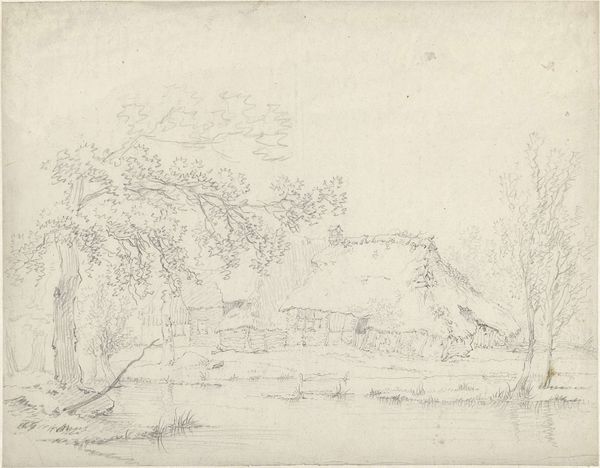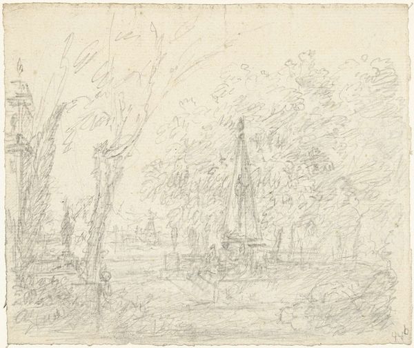 Editor: This drawing, "Villa met tuin," which roughly translates to "Villa with Garden," comes to us from Dionys van Nijmegen, sometime between 1715 and 1798. It’s a pencil and ink architectural sketch. To me, it has a whimsical feel, almost like something from a dream. What captures your attention in this piece? Curator: It's the imagined life nestled within those delicate lines that enchants me, really. This isn’t just a record of a place; it's an invitation into Nijmegen's mind. Picture him there, sketching away, dreaming of perfect geometric gardens…perhaps longing for that very space. What do you suppose he was feeling as he brought this villa to life on paper? Editor: I hadn't considered the emotional aspect so deeply, I was thinking more of it as a design or plan! Do you think it accurately depicts a real location, or is it more aspirational? Curator: Ah, that's the beautiful question, isn’t it? Given the Neoclassical influence, one could easily imagine these orderly gardens existing in reality, or, better still, taking inspiration from the perfectly balanced architecture of Roman design and urban life! It invites one to consider whether Nijmegen sought to imitate life, improve upon it... or simply play god by designing this perfect vision. What about the garden’s geometric shape? What do you see? Editor: It looks peaceful but maybe also contrived? A little unnatural... almost controlled. I guess it represents that Neoclassical idea of order versus nature. I now look at the sketch with completely new eyes... thank you. Curator: Exactly! So, in a way, through the drawing, the garden itself performs as the philosophical play of Nijmegen. The real genius is that we get to participate in this conversation centuries later. Editor: I hadn't thought about it that way. It’s amazing how a simple sketch can hold so much!
