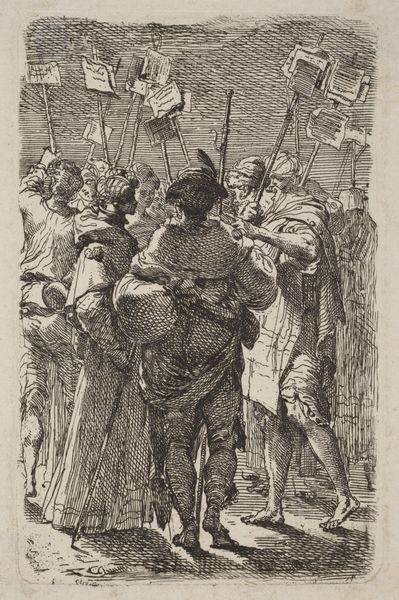 Editor: So this is "The Triumph of Marius" by Giovanni Battista Tiepolo, painted in 1729, oil on canvas. It feels very grand, almost theatrical, with everyone pressing forward in this parade. What do you see in this piece that I might be missing? Curator: It feels like stepping into a dream, doesn't it? The light is absolutely shimmering. To me, it's all about the fleeting moment of victory, transformed into something immortal. See how Tiepolo uses that almost dizzying perspective? It makes us feel right there, swept up in the fervor of the crowd. And those colours! They feel plucked from the sunset. I imagine Tiepolo standing before this canvas, eyes wide, feeling everything so deeply. What do you make of the figures themselves, their expressions? Editor: I guess they seem… idealized? Very Roman, very strong. Do you think it accurately portrays the actual event, or is it more of a fantasy? Curator: Ah, the delicious question of truth versus interpretation! I’d argue that Tiepolo isn't interested in a documentary-style retelling. He’s conjuring the essence of triumph, the feeling of it. Consider the Baroque period: theatricality reigned supreme! But it's always fun to dig deeper, question, push back against what feels immediately obvious. Have you ever felt like the artist, lost in the joy and pain of it all? Editor: It definitely makes me think differently about historical paintings, seeing it as less about accurate portrayal and more about capturing a feeling. Thanks for this perspective! Curator: And thank you for your fresh eyes! It's through these dialogues that we truly breathe life into these paintings.