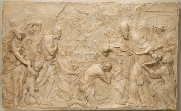 Massimiliano Soldani made this terracotta relief of the Agony in the Garden in Florence sometime in the late 17th or early 18th century. This image depicts the story from the Gospel of Luke, in which Jesus prays the night before his crucifixion. We see him kneeling in the garden of Gethsemane, comforted by an angel, while a host of cherubs looks on. Soldani has used the visual language of the Catholic Church to create a devotional artwork that is both moving and instructive. The whiteness of the terracotta makes the sculpture look like it is made out of marble. Florence in this period was dominated by the Catholic Church and its artistic patronage. Soldani's sculpture is a product of this environment, reflecting the religious and cultural values of his time. By studying the history of Florence and the Catholic Church, and their patronage of the arts, we can better understand the social conditions that made this sculpture possible. It gives us insight into the role of art in shaping and reflecting the values of its time.