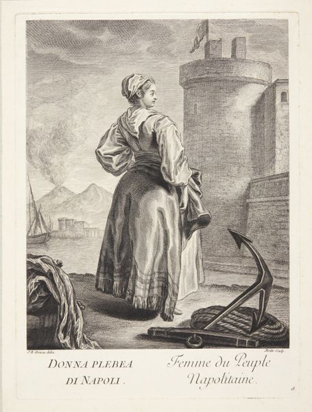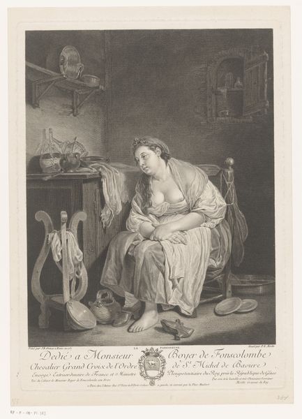 François Auguste Moitte created this print, Kvinde fra Frascati, during the late 18th century, a time when the representation of women was often laden with social expectations. Here, we see a woman from Frascati, a town near Rome, dressed in festive attire. The setting appears to be a wine cellar, where she is drawing wine from a barrel by candlelight. The image is not merely a depiction of daily life; it’s charged with the nuances of gender and class. Consider how women were often portrayed in art during this period. Was she being celebrated or was she being relegated to the domestic sphere? Moitte’s decision to show her engaged in this activity invites us to reflect on the roles women occupied and the values attributed to them. The emotional depth of the piece lies in its contrast: the woman’s finery set against the simplicity of her task. This artwork shapes our understanding of societal expectations and the personal realities of women during that time.