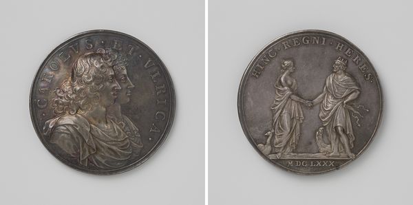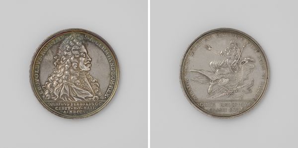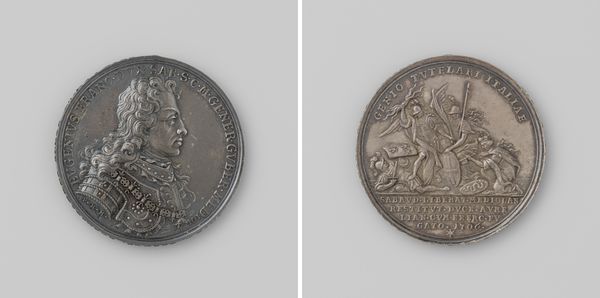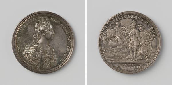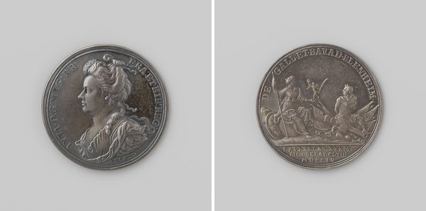 Editor: This is “Vrede te Aken,” or “Peace of Aachen,” a metal peace medal designed by Martin Holtzhey in 1748. It’s neat that it has two sides! One side shows a regal man, and the other features a seated figure holding scales. I’m curious: how do we interpret these symbols? Curator: This medal commemorates the Treaty of Aachen, which ended the War of the Austrian Succession. The regal man is likely a European leader involved in the treaty. But more interestingly, let's consider the figure on the reverse. Who do you think she represents? Editor: Justice? The scales definitely suggest something about balance or fairness. Curator: Exactly. Justice, or perhaps Astraea, the goddess of justice, returning to bring about a Golden Age. The lion beside her may be a symbol of power, now tempered by peace. These aren't simply aesthetic choices. What kind of statement do you think the artist is making, in this historical and political context? Editor: It’s advocating for peace through justice? Like, the treaty is *just*, and that's why it will bring a Golden Age? Curator: Precisely! The medal uses allegorical imagery to promote a particular narrative – the *justness* of the peace achieved. Consider whose story is being told here, and who gets to tell it. Editor: So, beyond just documenting a historical event, it's actively shaping its meaning? I see that the artist has an agenda. Curator: Exactly. Examining these objects reveals much about power dynamics and the ways history is constructed and disseminated through art. This helps me understand it from both the lens of history and cultural impact. Editor: It makes me rethink how medals, or any art, can be subtle forms of propaganda. Thanks for pointing that out!
