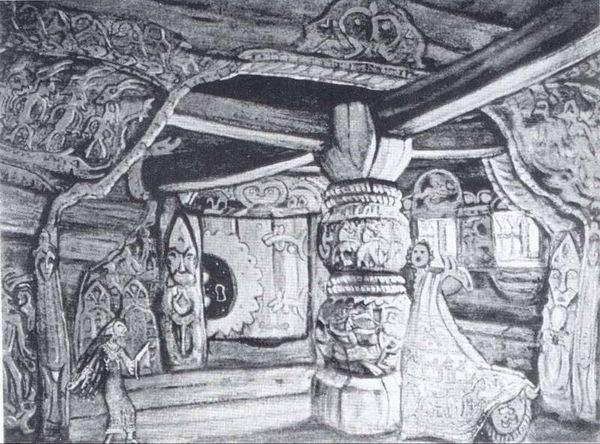 Editor: This is "Dwelling of Gunding," a pencil and pen drawing created in 1907 by Nicholas Roerich, currently residing in the Tretyakov Gallery. It feels quite intimate, like a glimpse into a secret space. I am fascinated by how Roerich captured the texture of the wood with such simple lines. What stands out to you? Curator: The 'Dwelling of Gunding' intrigues me primarily due to its depiction of an architectural space deeply rooted in cultural identity. Roerich was very much involved in Symbolism and Orientalism, and how it impacted Russian cultural production. Have you noticed the stylistic similarities between the pencil sketch and other pieces that feature archeological landscapes and architecture? Editor: Yes, I noticed Roerich's recurring themes of landscape and historical imagery in the artworks, but in this case I find a spiritual dimension related to dwellings. Curator: Precisely! Consider how this dwelling is rendered - not as a mere shelter but as a site infused with symbolic significance. The socio-political context here is crucial: Roerich, as many artists of his time, was grappling with questions of national identity, drawing from folklore and a sense of ancient wisdom to reflect the pre-petrine Russia that Slavophiles yearned for. This imagery often functioned as a powerful statement of cultural belonging. What do you feel about that? Editor: That makes a lot of sense, I didn't have such a rich background knowledge! So, is this a real dwelling? Or is Roerich using his artistic license? Curator: Perhaps both! While seemingly fantastical, elements likely echo authentic architectural details found in regions of Russia, thus grounding the artwork within a tangible, recognizable cultural reality even while elevating it through artistic interpretation and spiritual symbolism. This blend allowed artists to navigate complex socio-political terrain. Editor: It's incredible how much history and culture are embedded in what seems like a simple sketch. Thank you for shedding light on all the context behind it. Curator: It’s always exciting to see art serve as a powerful reflection, not only of its creator but the societal forces that shaped its creation.