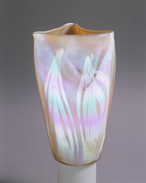 This glass tumbler, made by Challinor, Taylor and Company, captivates us with its swirling patterns. Note the confluence of purple, blue, and white, evoking marble, a symbol that bridges epochs and cultures, reminiscent of ancient Roman sculptures and Renaissance palaces. The marbleizing effect, achieved through skillful manipulation of molten glass, echoes motifs found in nature itself. Consider the turbulent flow, a dance of light and color that stirs primal emotions. It is a visual representation of the eternal struggle between chaos and order, a theme explored in countless myths and artworks across the ages. Like the swirling waters of ancient Greek pottery or the tempestuous skies painted by Romantic artists, this tumbler speaks to the human fascination with the forces that shape our world. The play of light on the surface hints at a cyclical progression. The tumbler reflects how artistic and cultural symbols resurface, evolve, and take on new meanings.