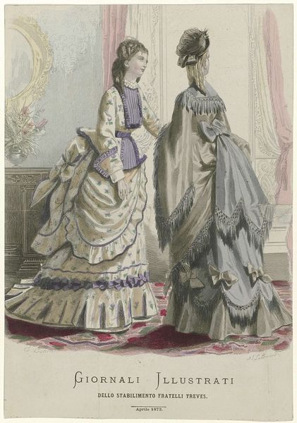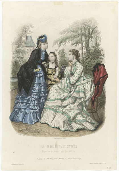 This fashion plate, printed around 1875, showcases the latest Parisian styles for ladies, focusing on the cut and fabrics of the garments. Note the emphasis on the waist, achieved through tight corsetry and accentuated by the placement of bows and drapery. These elements are not merely decorative; they reflect a deeper cultural obsession with control and artifice, reminiscent of the elaborate court dress of earlier eras. The bow, for instance, a seemingly innocent adornment, has its roots in symbols of binding and constraint, resurfacing throughout art history. We can find echoes of this motif in Renaissance portraits, where ribbons and knots signified marital bonds and social obligations. In this fashion plate, the bow, while softened and feminized, still whispers of societal expectations and the complex negotiations of identity. The clothing becomes a powerful medium, revealing how emotional and psychological undercurrents shape our material culture. The female form of this time was literally tied down! A cyclical progression of binding and adornment.