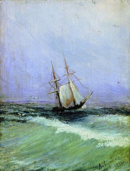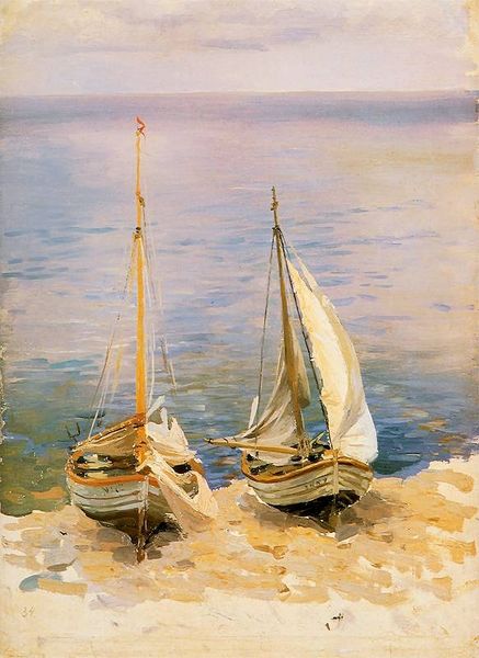 Editor: So, this is "Fishing Boats at Pourville" by Claude Monet, painted in 1882 using oil on canvas. It feels incredibly still, almost dreamlike with its hazy atmosphere. What strikes you most when you look at this painting? Curator: Initially, the interplay between light and reflection captivates me. Note the near symmetry achieved between the tangible forms of the boats and their spectral counterparts mirrored in the water. This mirroring fractures the image, compelling a deconstruction of the scene beyond a mere representational exercise. Editor: So it's more than just boats on water. It’s how he's showing them to us, right? The way the light bounces. Curator: Precisely. The brushstrokes, applied with a visible lack of blending, actively construct both form and light. Observe how Monet juxtaposes strokes of blues, greens, and yellows to conjure the illusion of shimmering water, rather than directly imitating its appearance. How do these techniques strike you? Editor: I think the brushwork is so loose that it blurs the lines between the boats and the sea. They're distinct objects, but sort of become one and the same. Curator: An astute observation. One could further contend that the formal elements—color, line, texture—transcend their referential roles, creating a self-referential dialogue within the canvas itself. This dialogue effectively destabilizes conventional notions of landscape painting. The subject is the painting itself, the object and the scene it creates. What have you learned from that approach? Editor: It really changes the way I see Impressionism. I think I'm seeing a new meaning to its interest in landscapes, now! Thanks so much for sharing this with me!