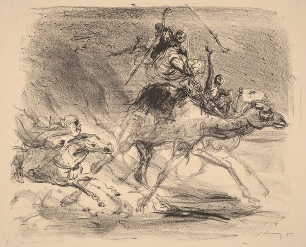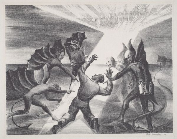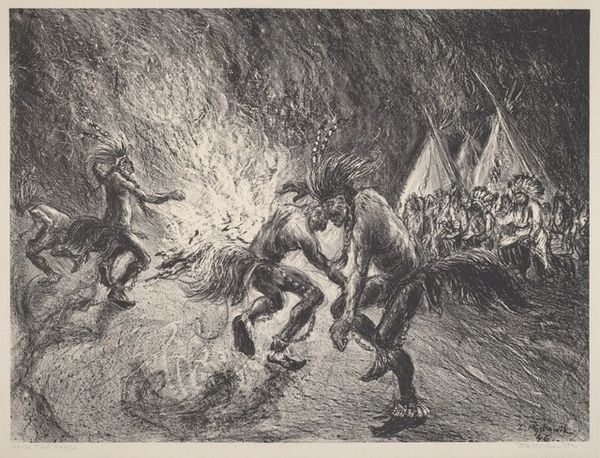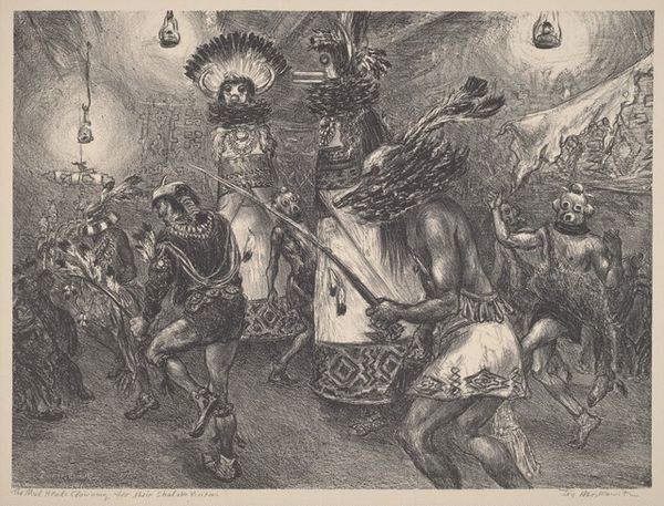 Ira Moskowitz made this lithograph titled ‘Eagle Dance’ sometime in the 20th century. The print depicts Native Americans engaged in a traditional dance, likely in the Southwestern United States. The image creates meaning through its depiction of cultural practices. The dancers, adorned with eagle feathers and ceremonial attire, perform a ritual that connects them to their environment and ancestral traditions. The presence of onlookers suggests the communal importance of the event. The lithograph captures a moment of cultural expression, yet we need to consider the historical context in which it was made. In the 20th century, Native American communities faced significant challenges, including forced assimilation and cultural suppression. Images like this one reflect the complex relationship between the dominant culture and indigenous communities, raising questions about representation, agency, and cultural preservation. To fully understand this lithograph, we might look to anthropological studies, historical accounts, and Native American voices. These resources help us understand the artwork as contingent on its social and institutional context.