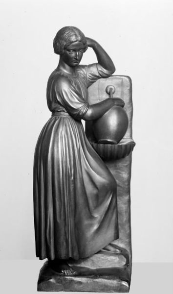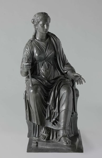 Curator: This is Johann Heinrich von Dannecker's sculpture, "The Muse of History," crafted between 1784 and 1794. It resides here at the Metropolitan Museum of Art. What's your initial read? Editor: She feels weighted, burdened even. The downward gaze and heavy drapery contribute to this solemnity. What was the cultural landscape that demanded such serious muses? Curator: Think about the Enlightenment era, the fervor for reason, the encyclopedic impulse to record and categorize. It seems pertinent to think about the cost of its production, perhaps with a local stone? This muse embodies history as an active force of documentation and assessment. Editor: Yes, but I can't ignore the muse as a subject – what power did women, even idealized, allegorical ones, hold at this juncture? She's not passive, but the act of ‘reading’ history becomes gendered, assigned. And let’s not forget the political undercurrent. The revolutionary fervor sweeping Europe at the time... Curator: Exactly. And in terms of manufacture, the choice of medium, likely stone, is critical. Each strike of the chisel, the time consumed - it all translates to value, prestige. Patrons desired to acquire such things and, with that, ideas. Think about the network of artists and buyers. The sculpture serves not only an aesthetic function, but a practical one as well, by reflecting societal values onto those who possess them. Editor: Definitely a period grappling with what constitutes power and its symbols. Is she intended to educate, inspire, or perhaps warn? The sculpture’s stoic face tells little, so perhaps we have to see this 'unrealistic statue' as a commentary on the limitations of history itself. Curator: Indeed. I think we agree then; "The Muse of History" captures a pivotal time. From labor and method, to the muse figure she depicts, we see evidence of how both making and ideology function. Editor: Absolutely, a marble embodiment of history as it was perceived, made, and actively shaped during those transformative years. The sculpture gives the public something tangible and representational of those processes to think about even now.