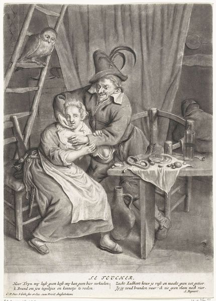 Curator: Before us, we have Cornelis Dusart's drawing "Liefdespaar," created between 1670 and 1704. Dusart, an artist from the Dutch Golden Age, worked in charcoal for this drawing, which can be seen here at the Rijksmuseum. Editor: Intimate, almost a whisper of a scene. I'm immediately drawn to the contrasting textures achieved with charcoal; the rough hatchings create form against the almost velvety dark background. It evokes a strong sense of light. Curator: The choice of charcoal, I think, adds a layer of symbolism. Consider the transience of charcoal itself – burnt wood, a relic of something consumed by fire. It resonates with the fleeting nature of such encounters, the blurred lines between genuine affection and ephemeral desire. Editor: Absolutely, the very materiality contributes to this reading. The composition itself—the slightly tilted table, the overlapping figures—creates visual instability. There’s a palpable tension. Is this intimacy or is it something more transactional? Curator: That's the ambiguity Dusart excels at! Their expressions… the man with his pipe, seemingly offering something, and the woman with the chalice, perhaps weighing her options. There is a ritual quality here – the pipe and drink acting as symbolic gestures within the dance of courtship or negotiation. Editor: Yes, a symbolic exchange. Also, look at the detailed rendering of fabrics, particularly the woman’s dress versus the man's rustic garb. Semiotically, it reinforces social stratification even within this seemingly private moment. Curator: And consider the waffle pattern so carefully rendered. Food, drink, touch, gaze… each plays a part in the performance. Even the seemingly innocuous detail of the tabletop props is fraught with symbolism—suggesting themes of hospitality, enticement, and perhaps even bargaining. Editor: It almost reads like a stage, doesn't it? Framed by the dark backdrop, with props carefully placed for maximum narrative impact. I appreciate how Dusart transforms what could be a simple genre scene into a complex interplay of forms, textures, and underlying social dynamics. Curator: It encourages us to contemplate the complexities within such encounters. Perhaps the title is meant to be ironic, given the underlying sense of social performativity on display here. Editor: I concur. This artwork teaches us that love and human relationships are always bound in semiotic codes waiting to be interpreted.